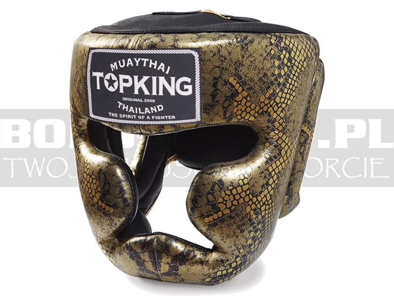 | Kask sparingowy do muay-thai Top King Snake Black-Gold. Wykonany z najwyższej jakości skóry naturalnej licowa miękkiej garbowanej, z motywem wężowej skóry. Wypełnienie z jednolitej tłoczonej pianki poliuretanowej wielowarstwowej średnio twardej, która świetnie tłumi uderzenia, rozkładając siłę po większej powierzchni, jak również charakteryzującej się niską wagą. Od wewnętrznej strony głowy gładki materiał umożliwiającym szybkie wkładanie i zdejmowanie kasku. Kask posiada zabudowę na uszy, ochronę kości policzkowych i podbródka, zapewnia szerokie pole widzenia przeciwnika, jego ruchów i kopnięć. Zapinany jest w dwóch miejscach od tyłu głowy na szeroki naprzemienny rzep, oraz od góry głowy w systemie sznurowanym, który najefektywniej sprawdza się w przypadku dopasowywania do gabarytów głowy zawodnika. Kaski pakowane są w tradycyjną torebkę foliową, dla ograniczenia ilości używanych opakowań.