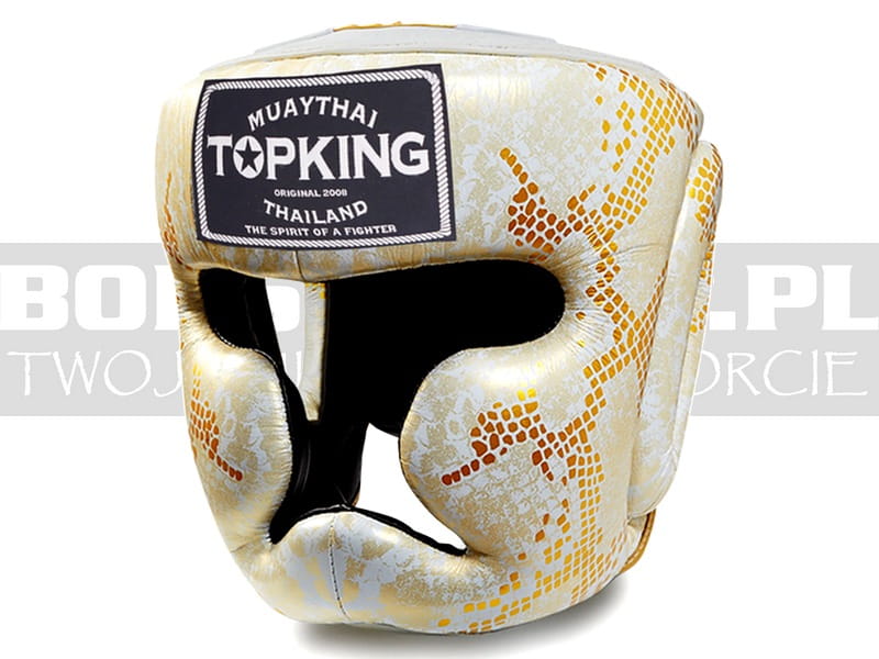| Kask sparingowy do muay-thai Top King Snake White-Gold. Wykonany z najwyższej jakości skóry naturalnej licowa miękkiej garbowanej, z motywem wężowej skóry. Wypełnienie z jednolitej tłoczonej pianki poliuretanowej wielowarstwowej średnio twardej, która świetnie tłumi uderzenia, rozkładając siłę po większej powierzchni, jak również charakteryzującej się niską wagą. Od wewnętrznej strony głowy gładki materiał umożliwiającym szybkie wkładanie i zdejmowanie kasku. Kask posiada zabudowę na uszy, ochronę kości policzkowych i podbródka, zapewnia szerokie pole widzenia przeciwnika, jego ruchów i kopnięć. Zapinany jest w dwóch miejscach od tyłu głowy na szeroki naprzemienny rzep, oraz od góry głowy w systemie sznurowanym, który najefektywniej sprawdza się w przypadku dopasowywania do gabarytów głowy zawodnika. Kaski pakowane są w tradycyjną torebkę foliową, dla ograniczenia ilości używanych opakowań.