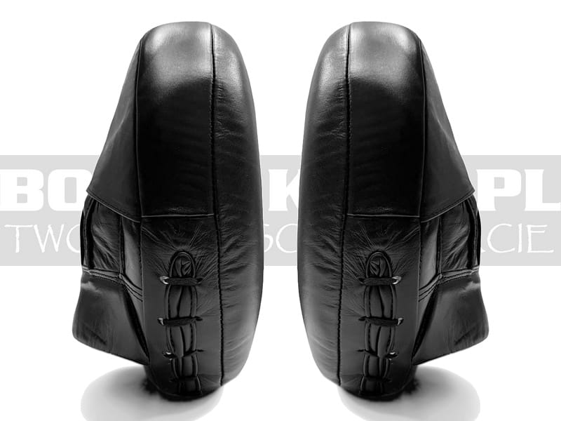 Łapy bokserskie Geezers Elite Pro Air Pads przeznaczone do wytracania siły uderzenia, amortyzując maksymalnie siłę i poprawiając kondycję zawodnika. Obecna wersja posiada poprawioną obniżoną wagę do 350gram szt. Wykonane z bardzo dobrej jakości skóry naturalnej w kolorze miętowym zielonym z białym punktem celownika. Tarcze wewnątrz posiadają miękką piankę o wysokiej sprężystości i grubości około 7cm, miękkie brzegi umożliwiają symulowanie uderzeń zwrotnych, od strony zewnętrznej naszyta kieszeń na dłoń z usztywnionym mankietem i osłoną palców, wewnątrz pod dłonią specjalnie naszyta zamszowa skóra mająca zapobiegać ślizganie się łapy na dłoni. Łapy sprzedawane w parach, pakowane w torebkę foliową. Łapy Air Pads należą do sprzętu który uzupełnia standardowe treningi na zwykłych tarczach, na twardych i innych łapach, ich wysoka miękkość, powoduje że przy zetknięciu z przeszkodą, przy każdym uderzeniu wydają głuchy odgłos, być może ten odgłos z upływem wyrabiania się i użytkowania zanika, lecz nadal powodują że rękawica która uderza w łapę wytraca swój impet, zagłębia się w miękki środek tarczy i zawodnik szybciej odczuwa zmęczenie. Wytrzymałość tarcz wszystkich tego typu tarcz uzależniona jest od siły uderzenia w nie. Łapy posiadają około 26x22cm są to nasze wymierzone wymiary, producent może podawać inne parametry. Przez niektórych trenerów łapy uznane za najlepsze skórzane łapy dostępne na naszym rynku w tym przedziale cenowym. |