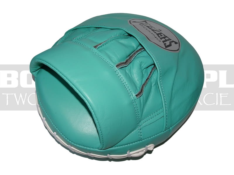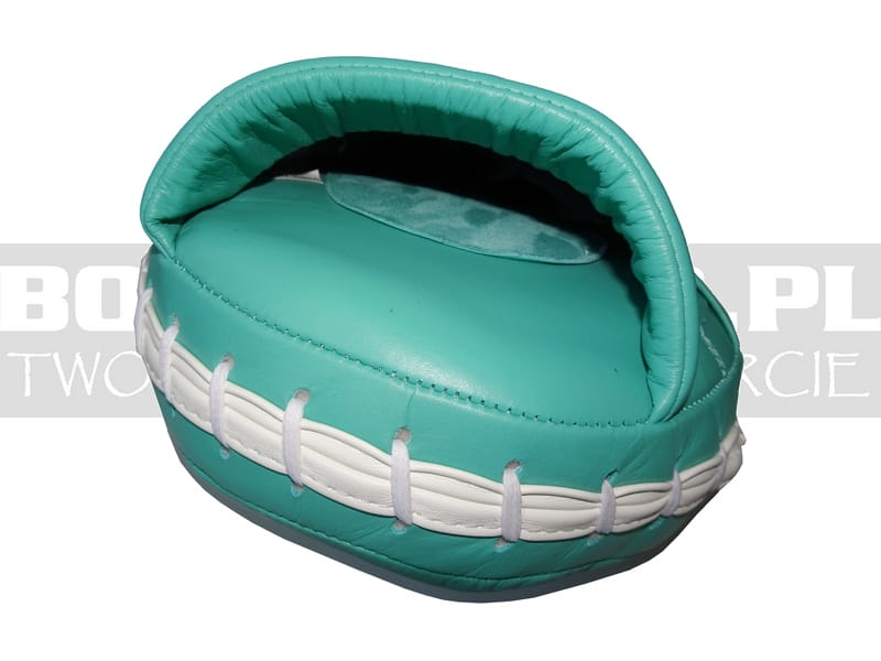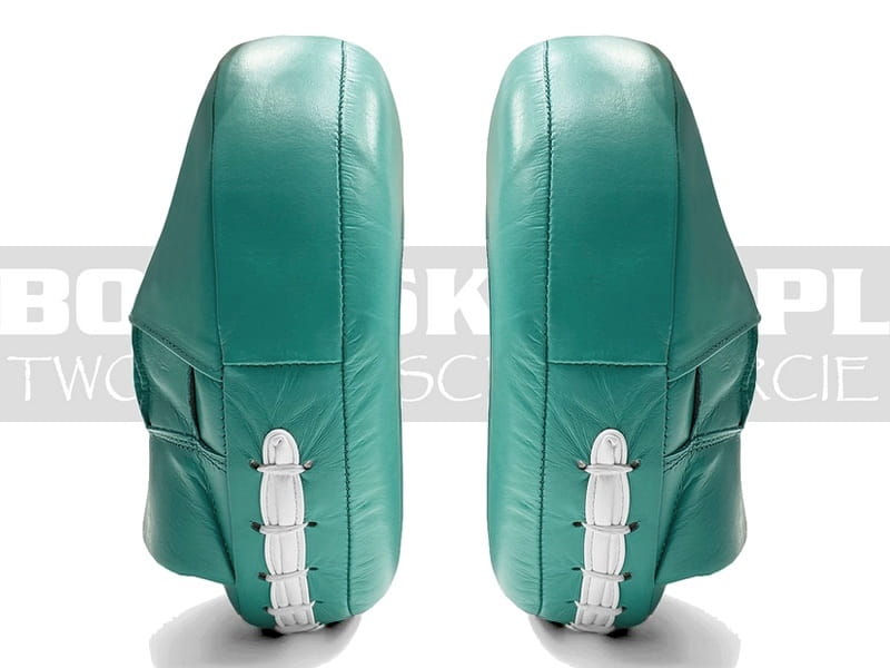 Łapy bokserskie Geezers Elite Pro Air Pads przeznaczone do wytracania siły uderzenia, amortyzując maksymalnie siłę i poprawiając kondycję zawodnika. Obecna wersja posiada poprawioną obniżoną wagę do 350gram szt. Wykonane z bardzo dobrej jakości skóry naturalnej w kolorze miętowym zielonym z białym punktem celownika. Tarcze wewnątrz posiadają miękką piankę o wysokiej sprężystości i grubości około 7cm, miękkie brzegi umożliwiają symulowanie uderzeń zwrotnych, od strony zewnętrznej naszyta kieszeń na dłoń z usztywnionym mankietem i osłoną palców, wewnątrz pod dłonią specjalnie naszyta zamszowa skóra mająca zapobiegać ślizganie się łapy na dłoni. Łapy sprzedawane w parach, pakowane w torebkę foliową. Łapy Air Pads należą do sprzętu który uzupełnia standardowe treningi na zwykłych tarczach, na twardych i innych łapach, ich wysoka miękkość, powoduje że przy zetknięciu z przeszkodą, przy każdym uderzeniu wydają głuchy odgłos, być może ten odgłos z upływem wyrabiania się i użytkowania zanika, lecz nadal powodują że rękawica która uderza w łapę wytraca swój impet, zagłębia się w miękki środek tarczy i zawodnik szybciej odczuwa zmęczenie. Wytrzymałość tarcz wszystkich tego typu tarcz uzależniona jest od siły uderzenia w nie. Łapy posiadają około 26x22cm są to nasze wymierzone wymiary, producent może podawać inne parametry. Przez niektórych trenerów łapy uznane za najlepsze skórzane łapy dostępne na naszym rynku w tym przedziale cenowym. |